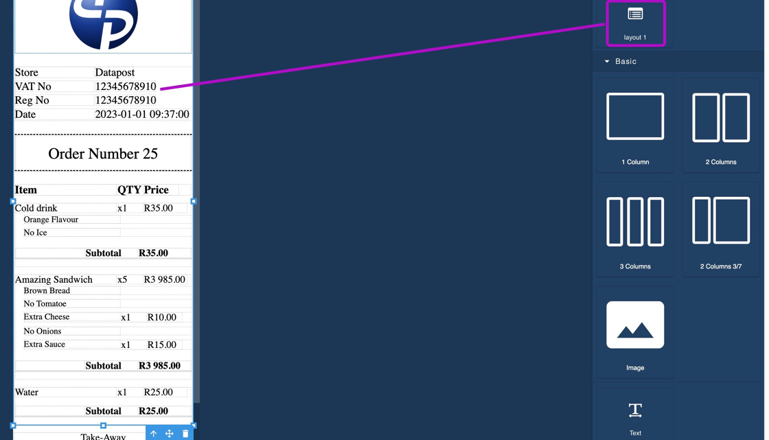 6. Click and drag one of the layouts from under "Receipt Layouts" onto the blank canvas.